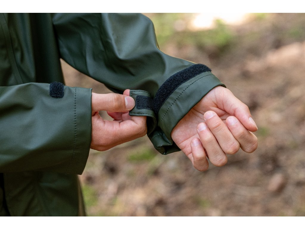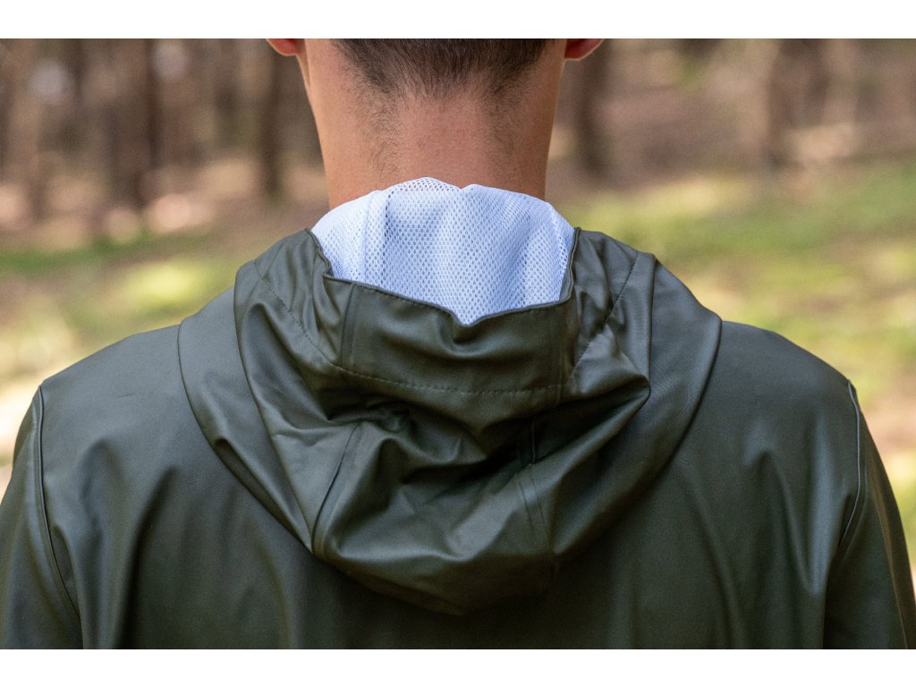 Nepromokavý kabát se svařovanými švy z PU materiálu. Slouží jako ideální pláštěnka, kterou lze nosit během několika ročních období. Zapíná se na zip i knoflíky. Kapuce je nastavitelná pomocí šňůrky a konce rukávů lze upravit suchým zipem. Dvě prostorné přední kapsy bez zipu. Reflexní potisk na zádech zajišťují lepší viditelnost.