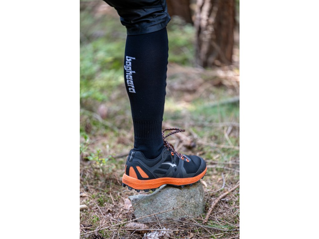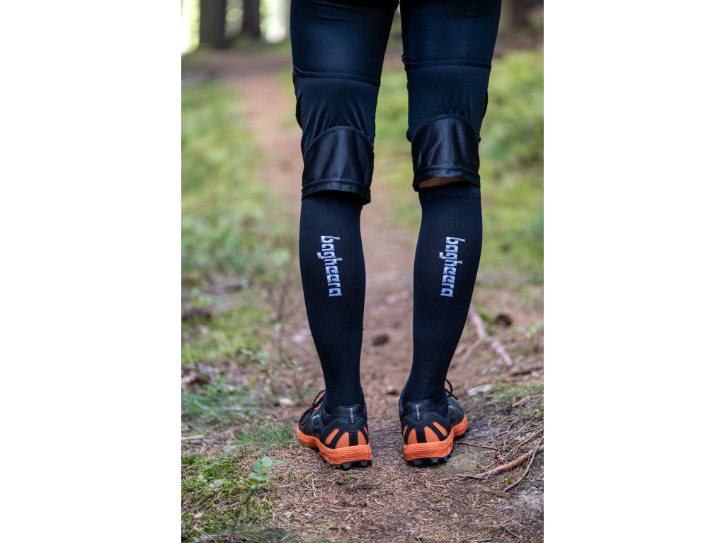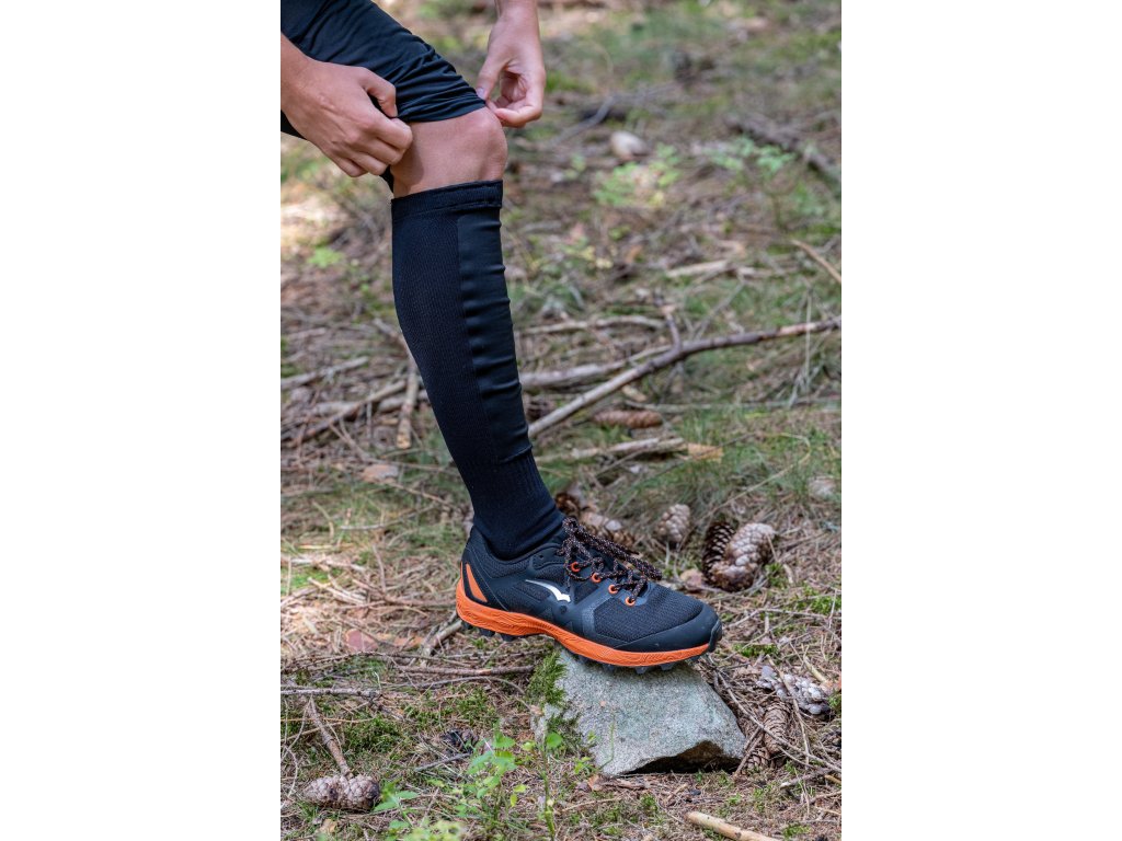 Orienteering Socks jsou odolné ponožky navržené speciálně pro orientační běh a běhání v náročném terénu. Díky zesílenému panelu na přední straně chrání holeně před větvemi a křovinami. Horní elastický lem se silikonovým páskem zajišťuje, že ponožky během pohybu nesklouzávají, a žebrované pletení kolem klenby a kotníku poskytuje pohodlnou oporu i při dlouhém výkonu. Vyrobeny z odolné polyamidové směsi, která vydrží i intenzivní používání.