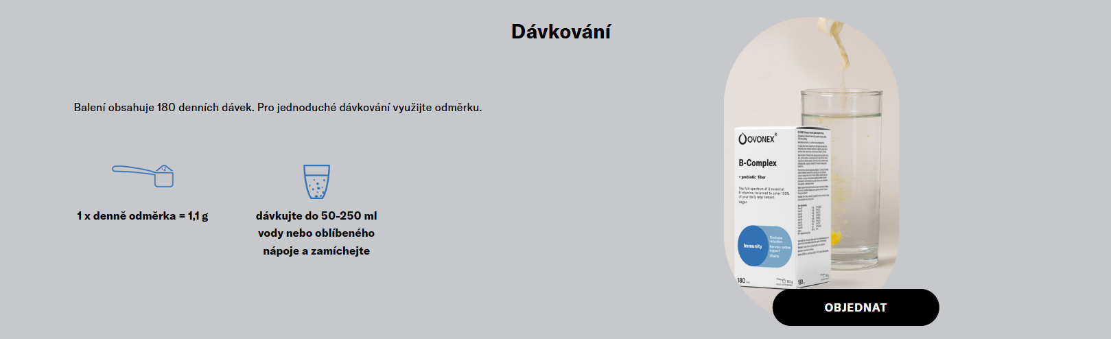 Každá dávka OVONEX B-komplexu obsahuje všech 8 klíčových vitamínů skupiny B ve vyváženém poměru podle jejich vstřebatelnosti. U všech vitaminů B najdete ve složení výrazně vyšší hodnoty než 100 % RHP – je to záměr. Tělo vitaminy skupiny B špatně vstřebává a navíc si je neukládá, proto je potřeba dodat je ve větší dávce.